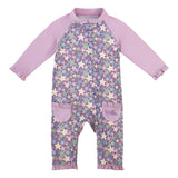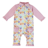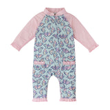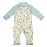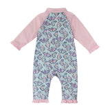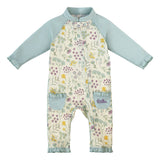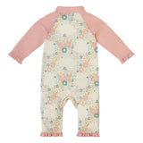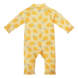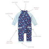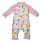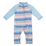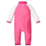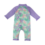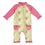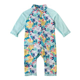 Full front zipper closure makes suit a breeze to throw on and take off, even when wet. Diaper changes have never been easier. - Ruffled Hem