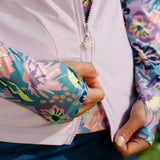 Zipper pull changes color when exposed to UV light, showing when sun rays are most intense. - Thumb Holes at End of Sleeves