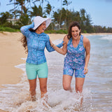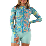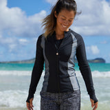 Full length front zipper closure makes rashguard a breeze to pull on and take off, even when wet. - UV Detecting Zipper Pull